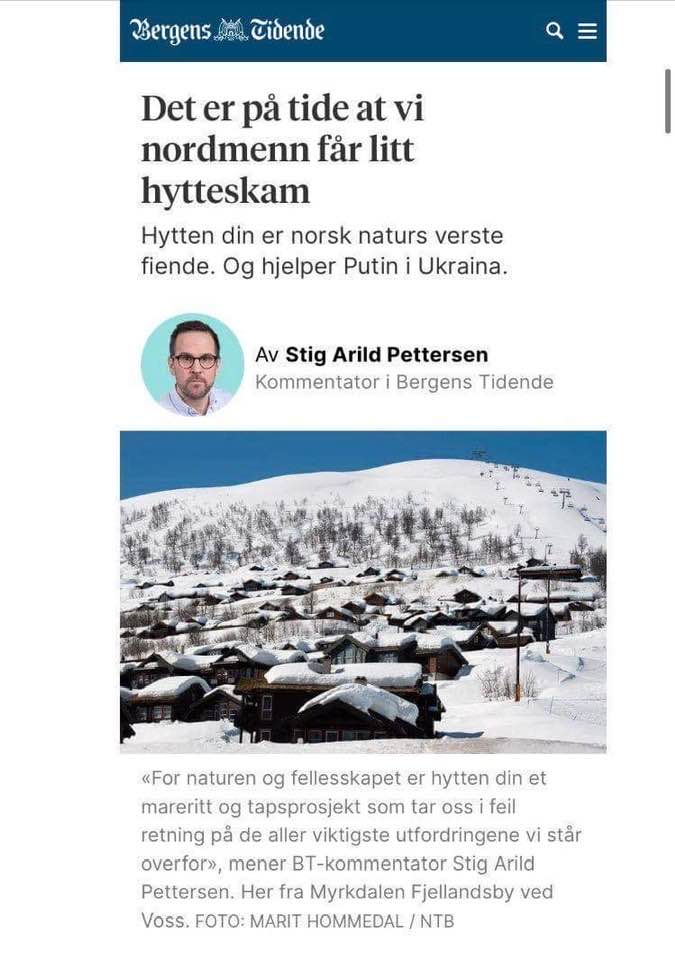Bergens Tidende vil altså at norske hyttefolk skal føle skam. Vi for vår del vil si at det er norske politikere som bør føle skam over det uføret de har ført oss alle ut i. Ikke har vi et forsvar som duger, ikke har vi en matsikkerhet som duger, og ikke har vi så mye som et beredskapslager for korn.
