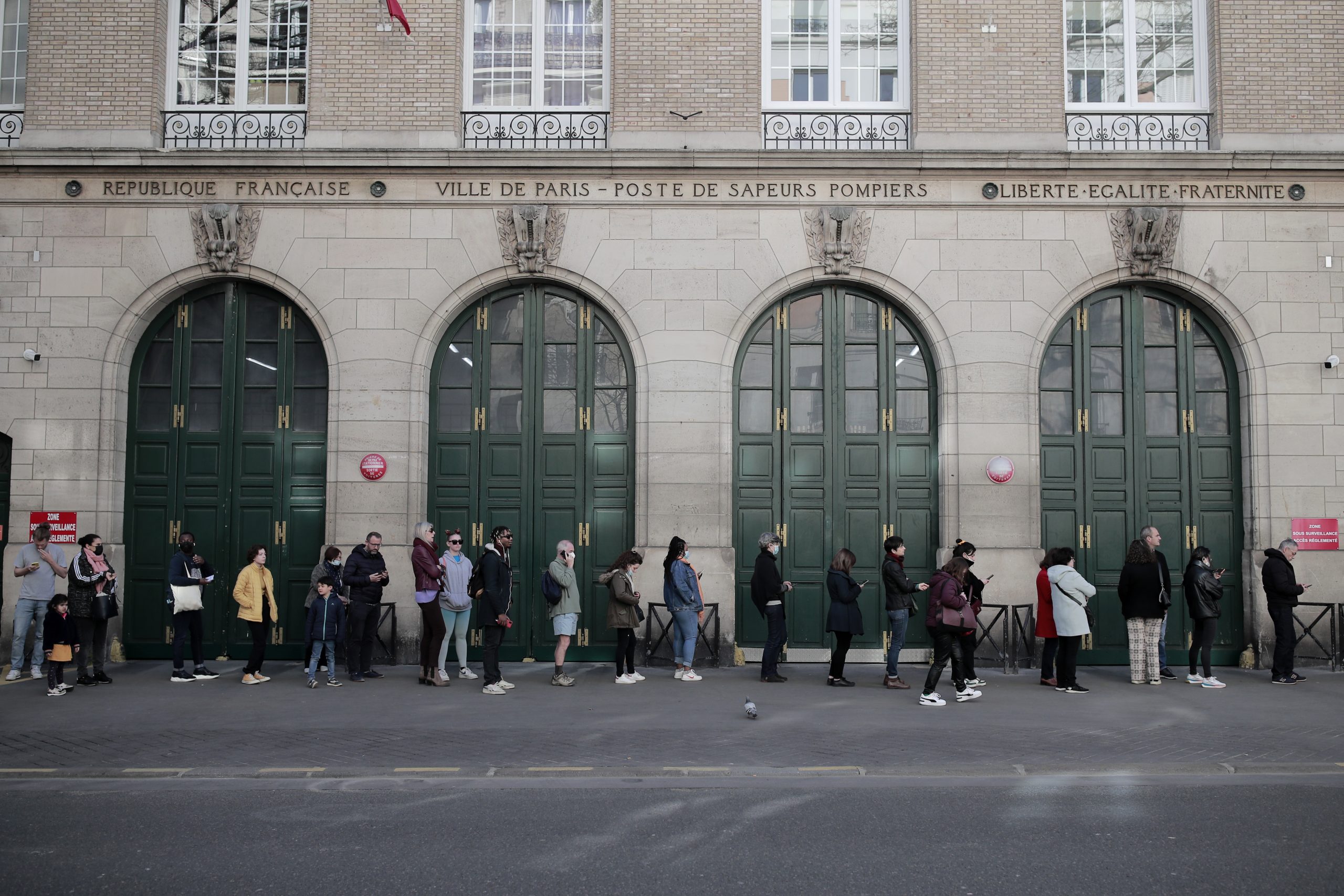 Folk står i kø for å stemme ved det franske presidentvalget i Paris 10. april 2022. Foto: Lewis Joly / AP / NTB.