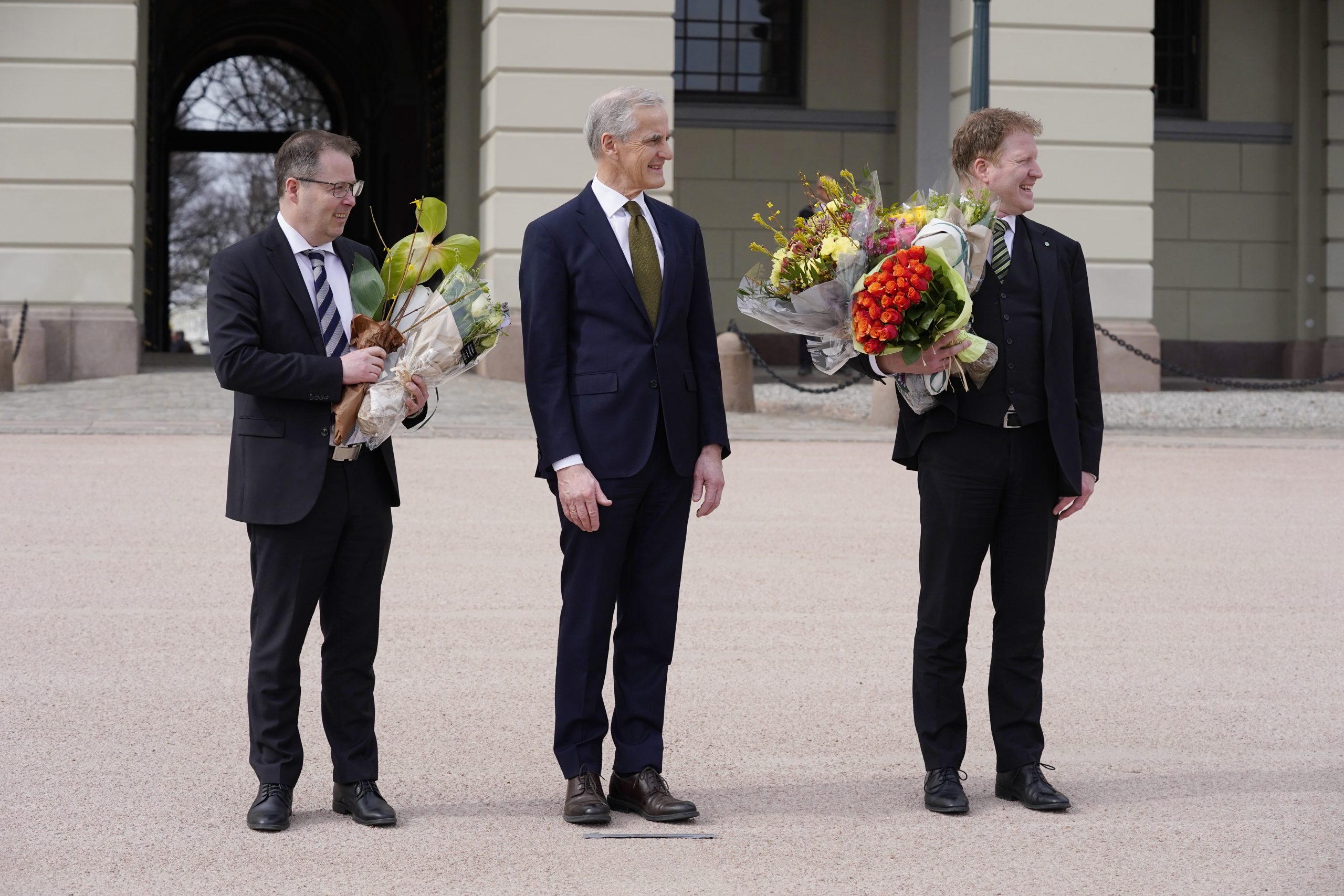 Etter et kort ekstraordinært statsråd på Slottet kom Gram og Gjelsvik gående ut på Slottsplassen sammen med statsminister Jonas Gahr Støre (Ap).