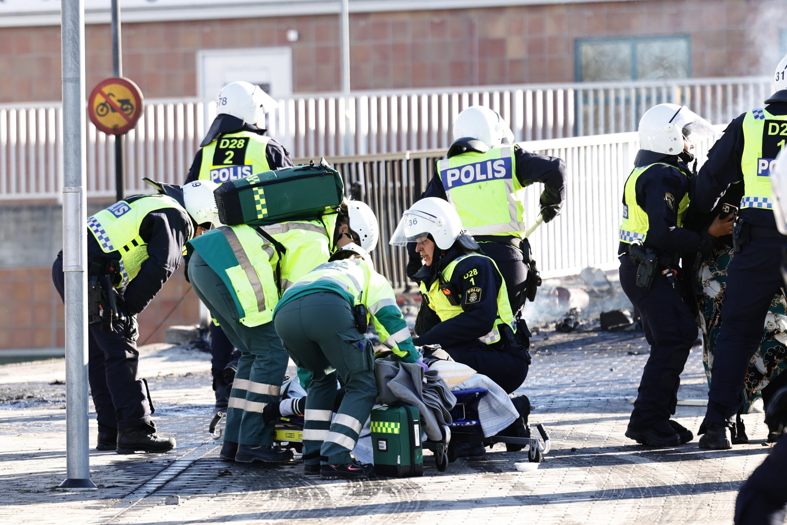 Politi og ambulansepersonell tar hånd om en person som er blitt skutt i benet under opptøyene i Navestad i Norrköping den 17. april 2022. Foto: Stefan Jerrevång /TT / NTB.