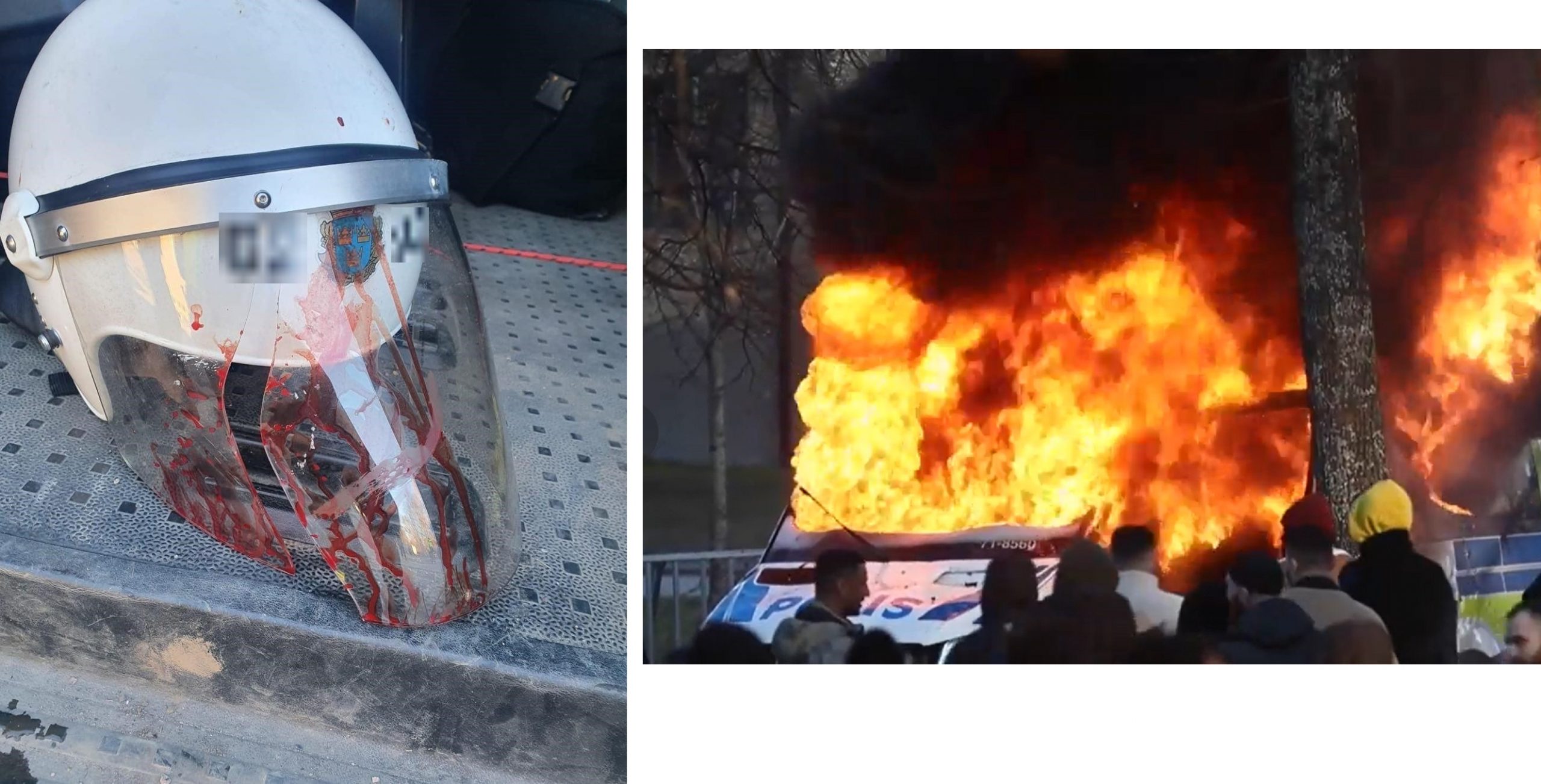 En politimann fikk en stein kastet i hodet så hjelmen sprakk. Han ble kjørt til sykehus i ambulanse. Politimannen Björn forteller:
