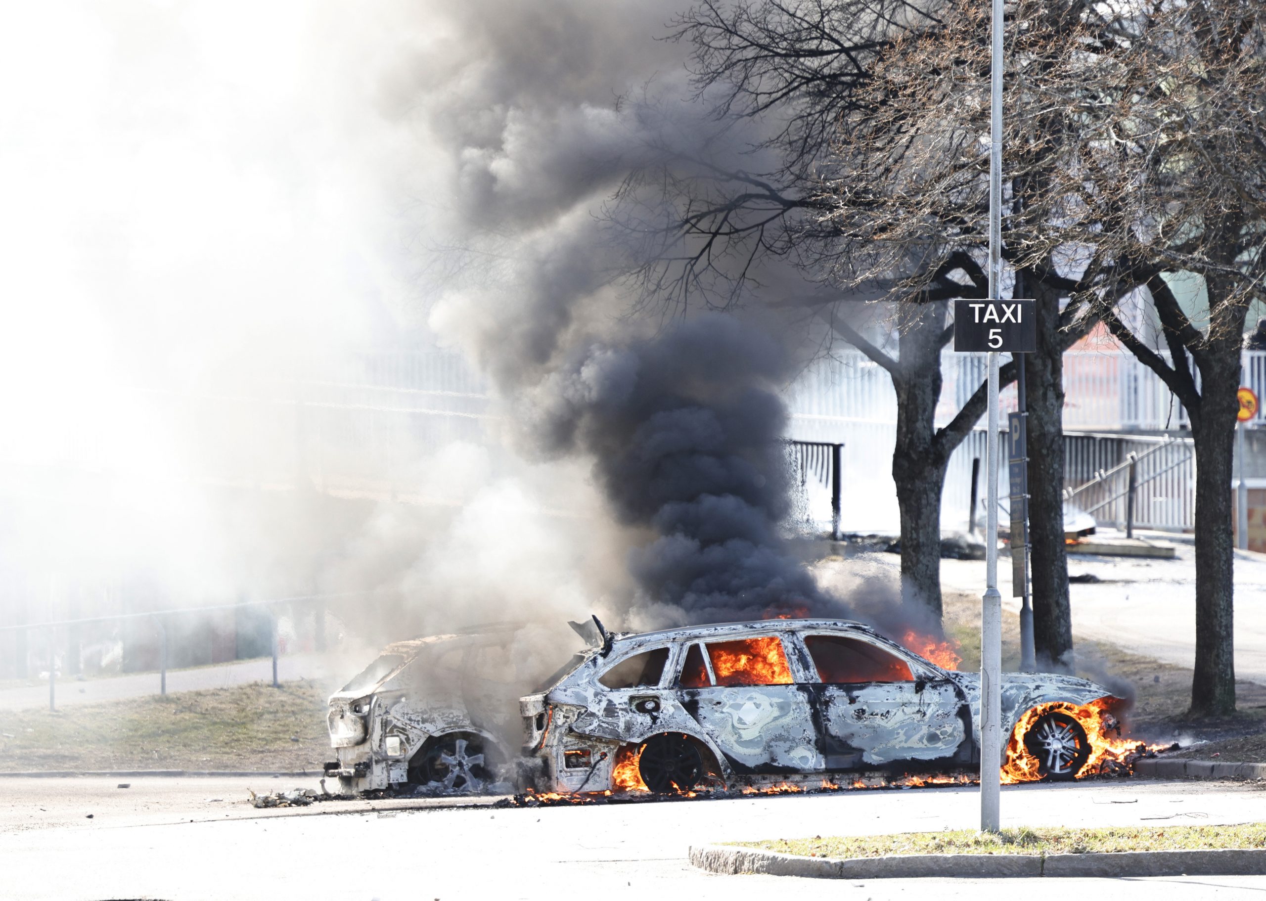 To biler brenner i Norrköping under opptøyene i byen den 17. april 2022. Foto: Stefan Jerrevång / TT / NTB.