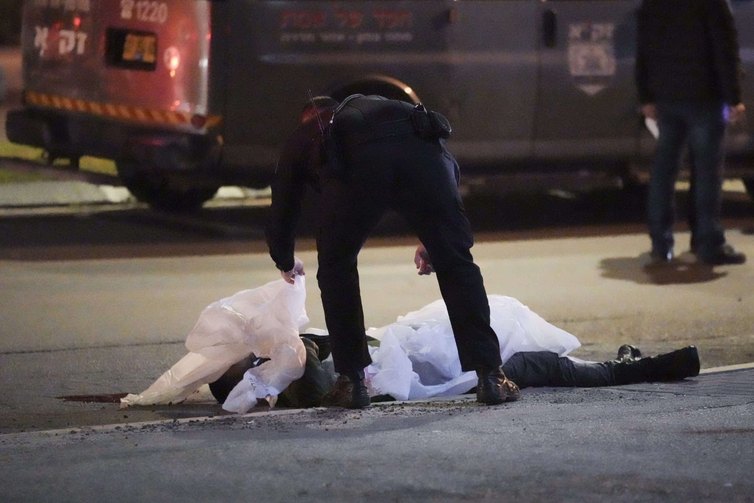 En israelsk politimann dekker til et av ofrene for terrorangrepet i Hadera 27. mars 2022. Foto: Ariel Schalit / AP / NTB.