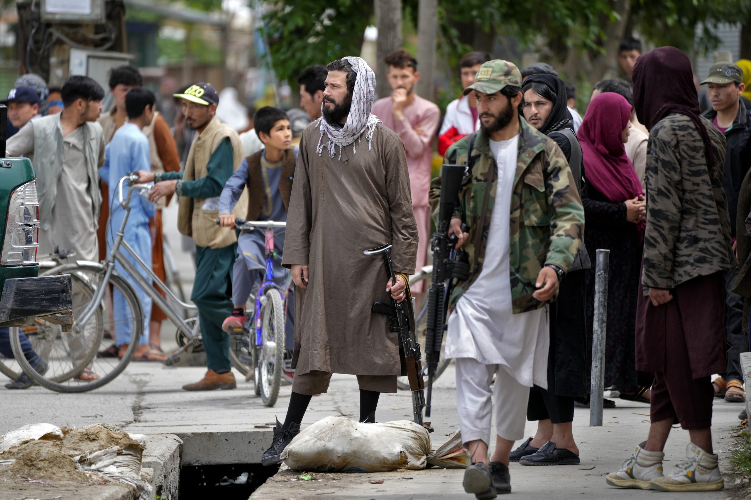 Taliban-krigere ved et terroråsted utenfor en skole i Kabul, Afghanistan. Foto: AP Photo/Ebrahim Noroozi