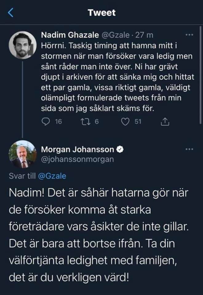 Ingenting av dette så politiledelsen noe problem med. Islamofobi og rasisme var så stor at Nadim Ghazale hadde ledelsens fulle tillit og ble til og med forsvart av justisminister Morgan Johansson. Støtten ser ut til å ha styrket Ghazales selvbilde, for i dag er han den anerkjente forfatteren av boka med den beskjedne tittelen Min väg från flykting till hela Sveriges polis.