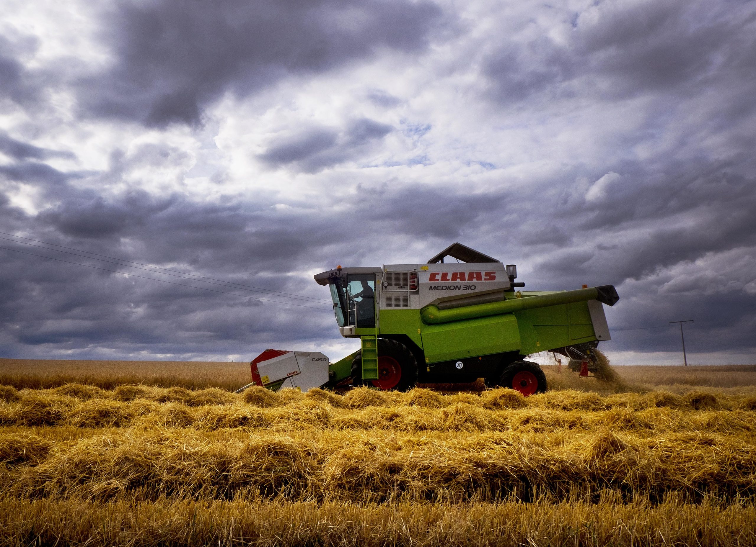 En bonde høster inn med skurtresker på et jorde utenfor Frankfurt 9. juli 2018. Foto: Michael Probst / AP / NTB.