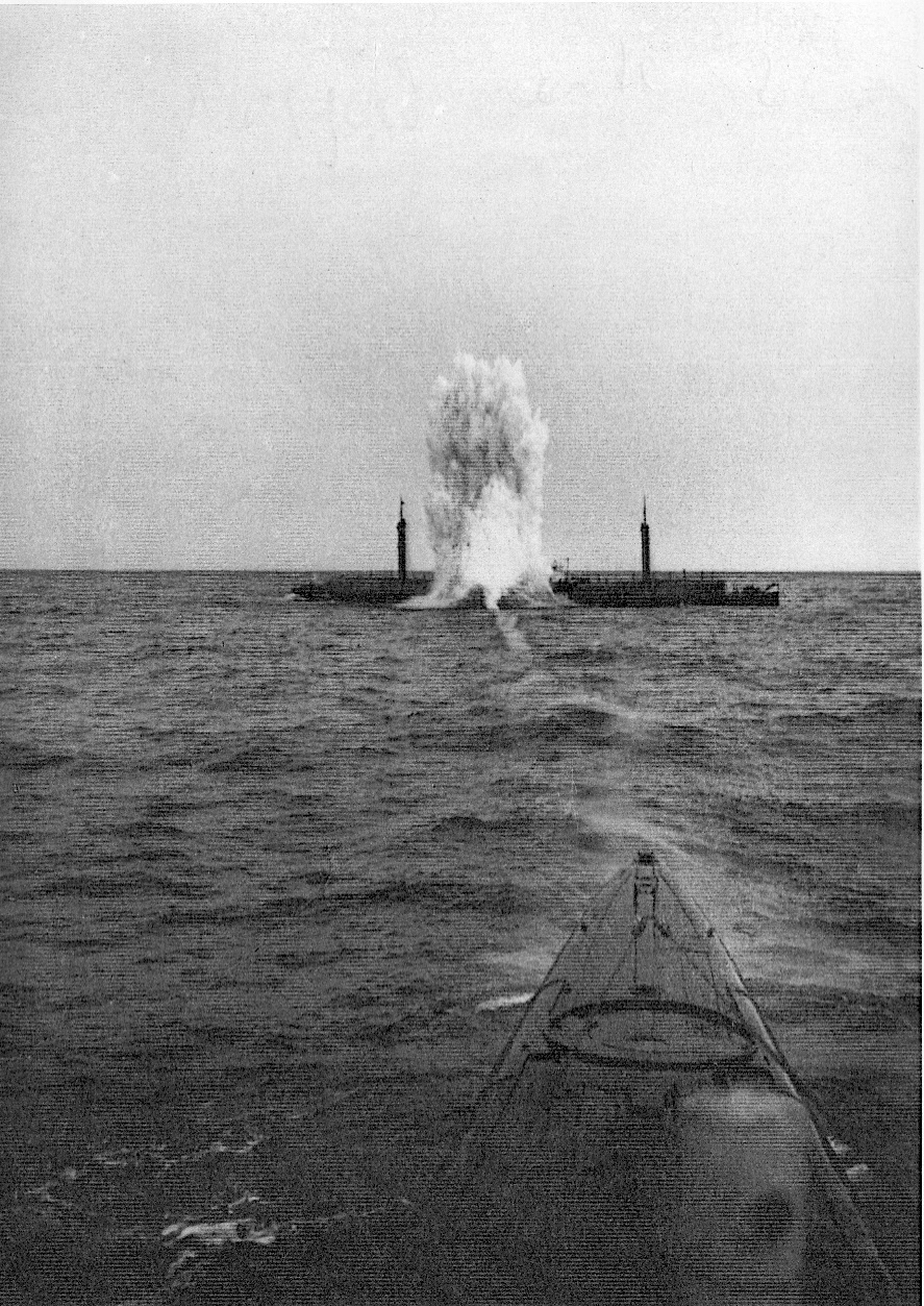 Da det nøytrale Sverige av Keiser-Tyskland i 1916 ble tvunget til å sperre Øresund, mistet Tsar-Russland forsyningslinjen vestfra gjennom Østersjøen. Damperne med våpen, proviant og andre forsyninger måtte ta den lange veien gjennom Barentshavet til den nye havnebyen Murmansk, som var under bygging. De tyske ubåtene fulgte etter og senket 60-70 handelsskip mellom Nordkapp og Vardø. Første verdenskrig hadde nådd Arktis. Bildet er tatt fra broen på en tysk ubåt som torpederer lastebåten «Knut Hilde» i 1916. Foto: Erling Skjolds arkiv.