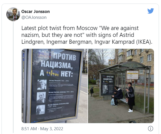 En reklamekampanje der svensker blir fremstilt som nazister er satt i gang i Russland. Fra plakater på bussholdeplasser i Moskva er meldingen tydelig: «Vi er mot nazismen – det er de ikke!»