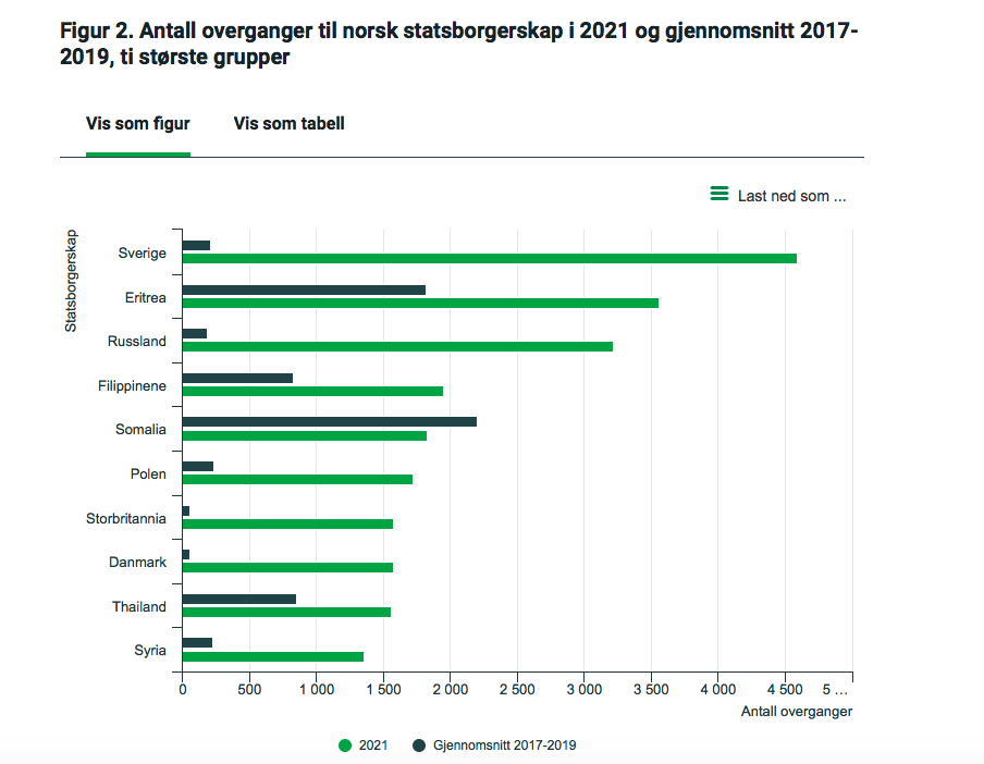 41.100 personer fikk innvilget norsk statsborgerskap i 2021, over dobbelt så mange som i 2020. Det er det høyeste antallet noensinne.
