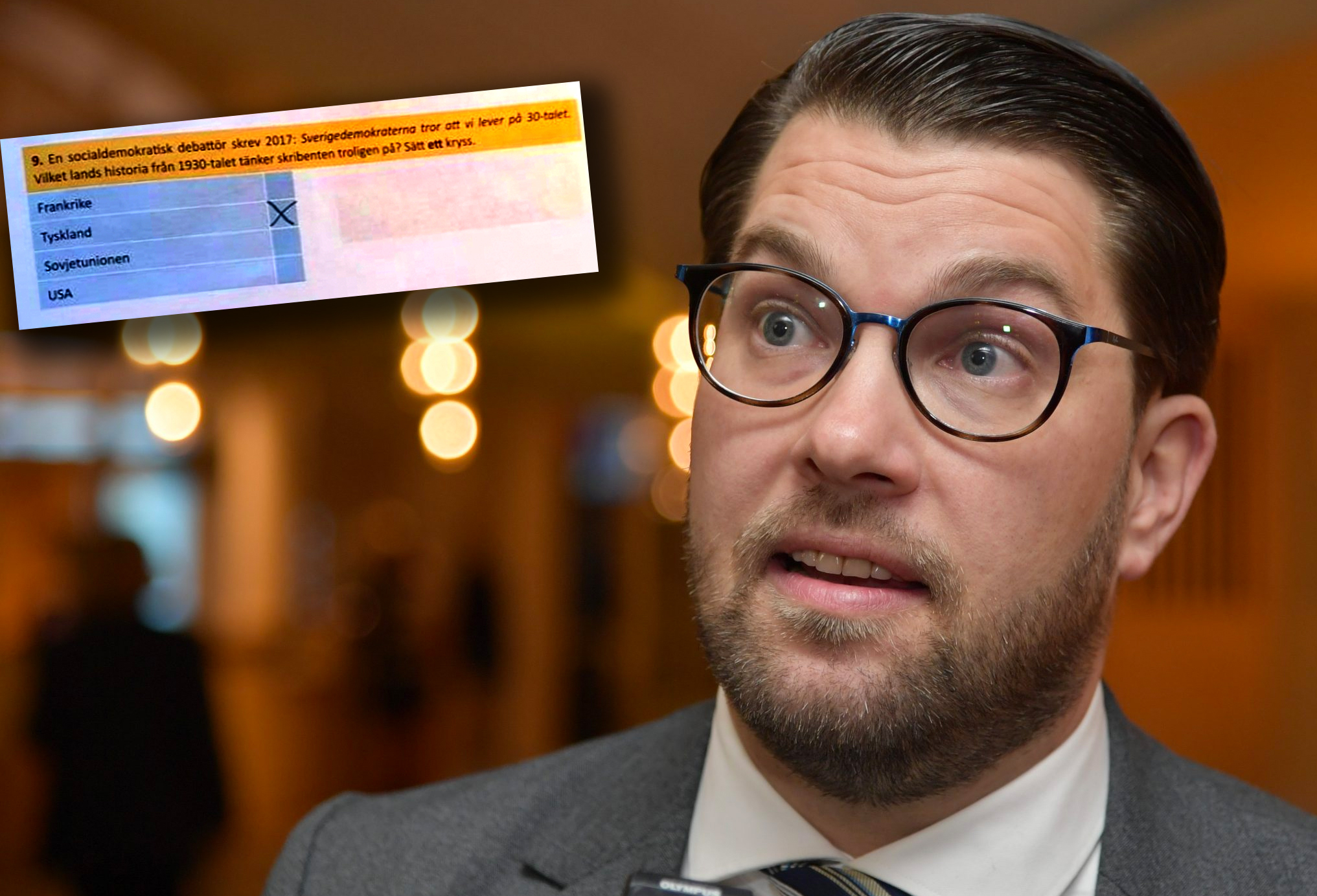Partileder Jimmie Åkesson raser etter at han ble gjort oppmerksom på at Sverigedemokraterna knyttes til Nazi-Tyskland i Sveriges nasjonale prøve: