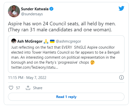 I det siste lokalvalget fikk det islamske partiet Aspire flertall og tar over kontrollen fra Labour i Tower Hamlets i London. Av de 32 kandidatene som Aspire hadde på sin liste, så var det 31 menn og en kvinne i hijab. Den nye borgermesteren heter Lutfur Rahman. Alle de 25 valgte muslimske mennene fra Aspire har bakgrunn fra Bangladesh. De kontrollerer nå bydelen politisk.