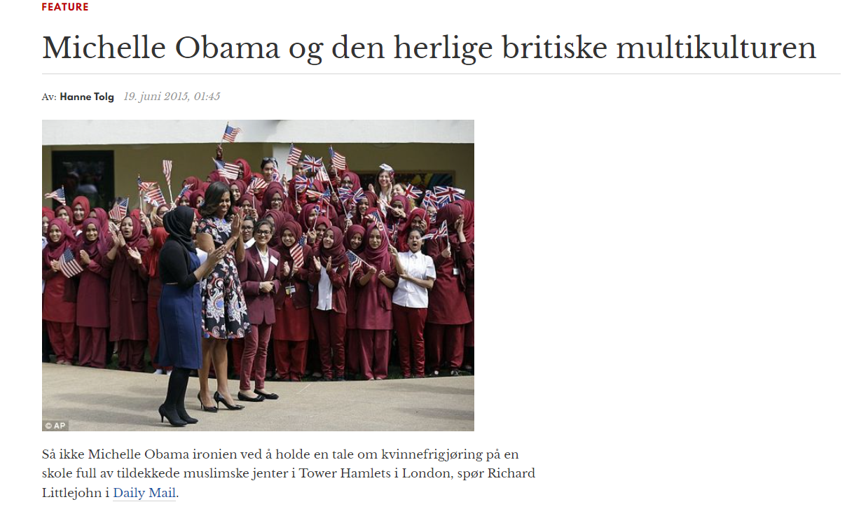 Ikke alle er like bekymret for islamisering. Michelle Obama var med for å feire «multikulturen» i Tower Hamlets da hun besøkte en jenteskole med 90 prosent muslimske jenter med røtter fra Bangladesh: