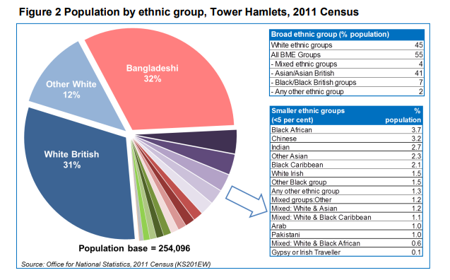 Offisielle tall fra folketellingen i 2011 (foretas hver 10. år og neste publisering blir senere i 2022) viser at personer med bakgrunn fra Bangladesh er den mest dominerende gruppen i Tower Hamlets. Sannsynligvis er det langt færre hvite briter i Tower Hamlets nå.