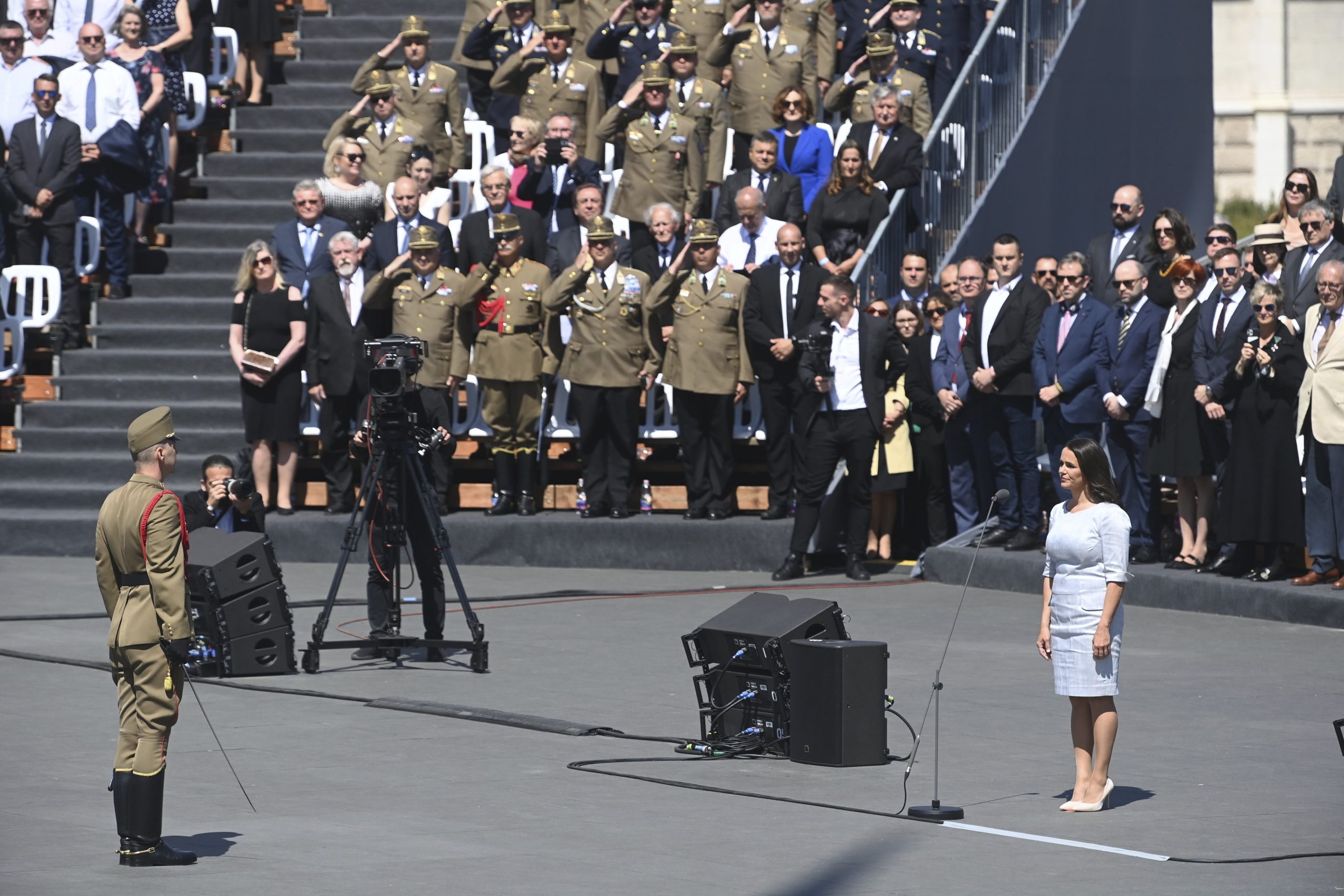 Katalin Novak innsettes som Ungarns president under en seremoni på Kossuth-plassen utenfor parlamentet i Budapest den 14. mai 2022. Foto: Noemi Bruzak / MTI via AP / NTB.