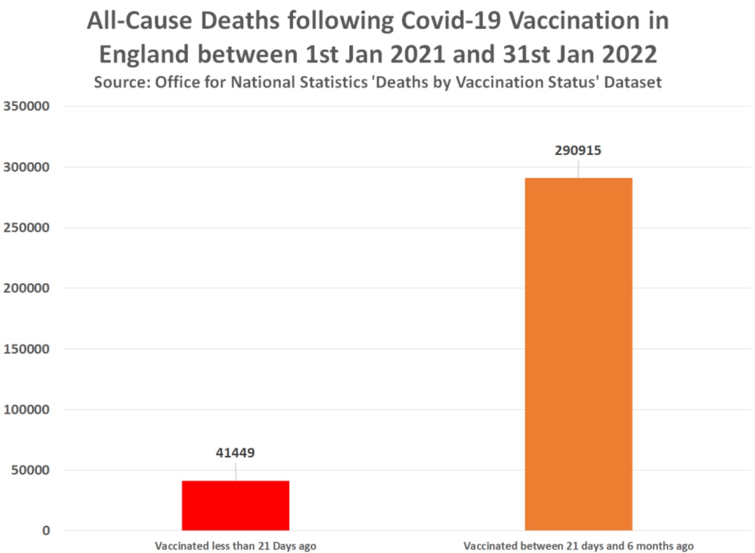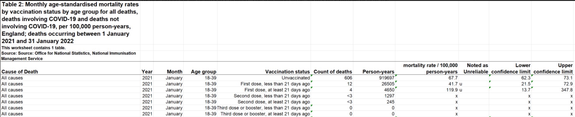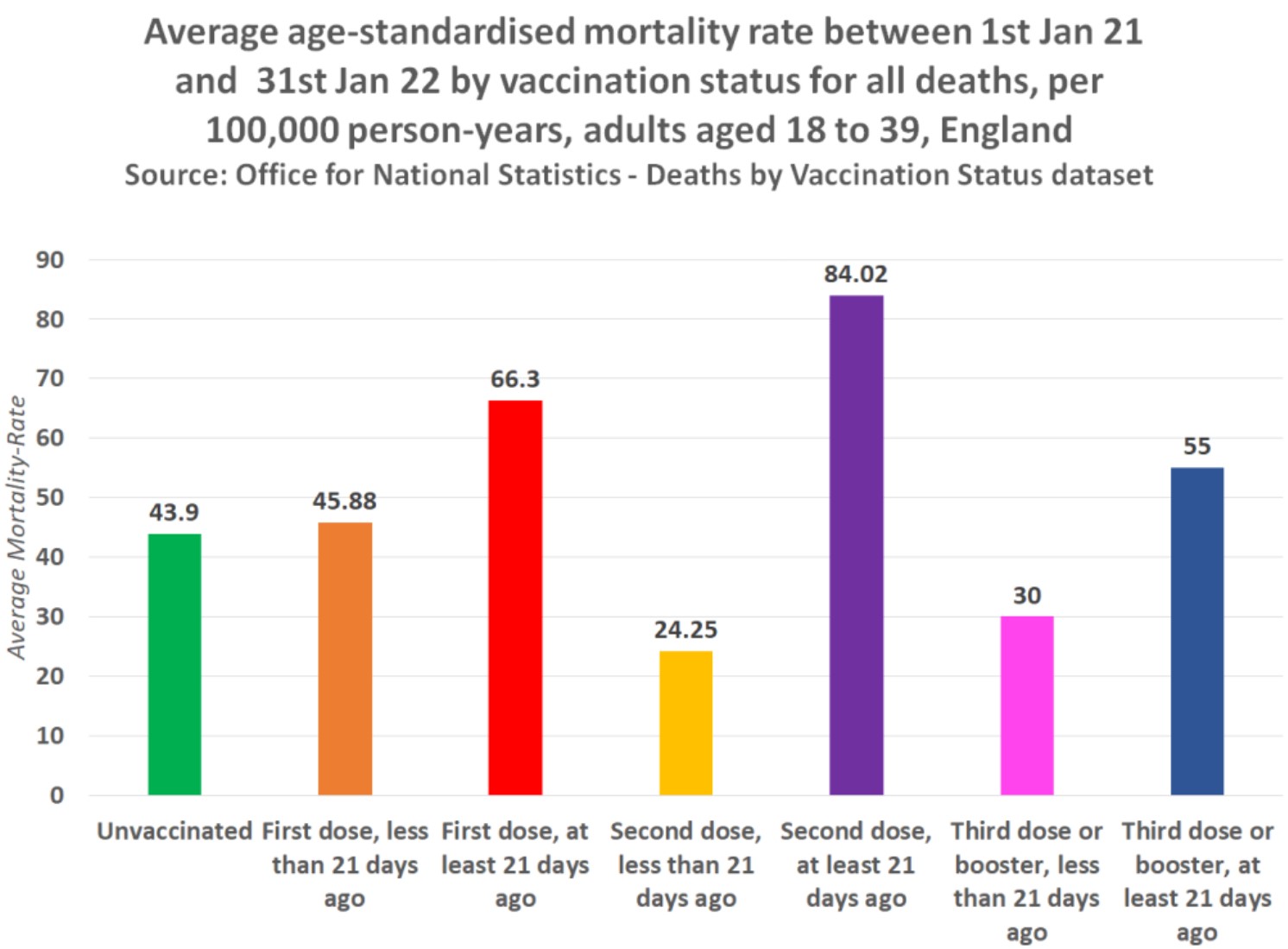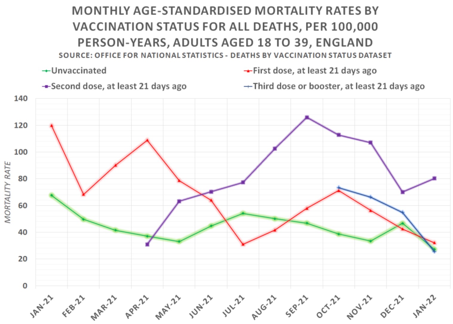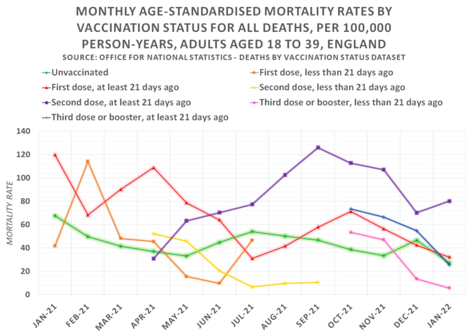 Diagrammet ovenfor viser dødelighet av alle årsaker etter vaksinasjonsstatus pr. 100 000 personer/år i alderen 18 til 39 år i England. Den grønne linjen viser relativt stabil dødelighet blant uvaksinerte. De øvrige linjene representerer ulike vaksinasjonsstatuser.