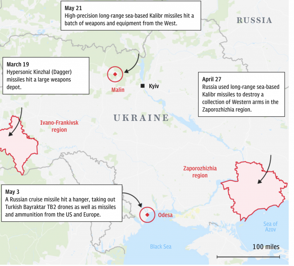 Ett annet friksjonsfelt er utenlandske våpenleveranser. Telegraph offentliggjør et kart som angivelig viser russiske rakettangrep som ødela slike leveranser før de ble fordelt.