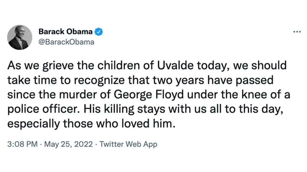 Massakren skjedde på en tirsdag. Onsdag var det to år siden George Floyd. Obama syntes det var en god idé å koble de to. Obama er blitt en social justice warrior. Det gjelder om å kanalisere den emosjonelle reaksjonen på skolemassakren slik at det gir politisk fordel for Demokratene, som ellers ligger dårlig an.