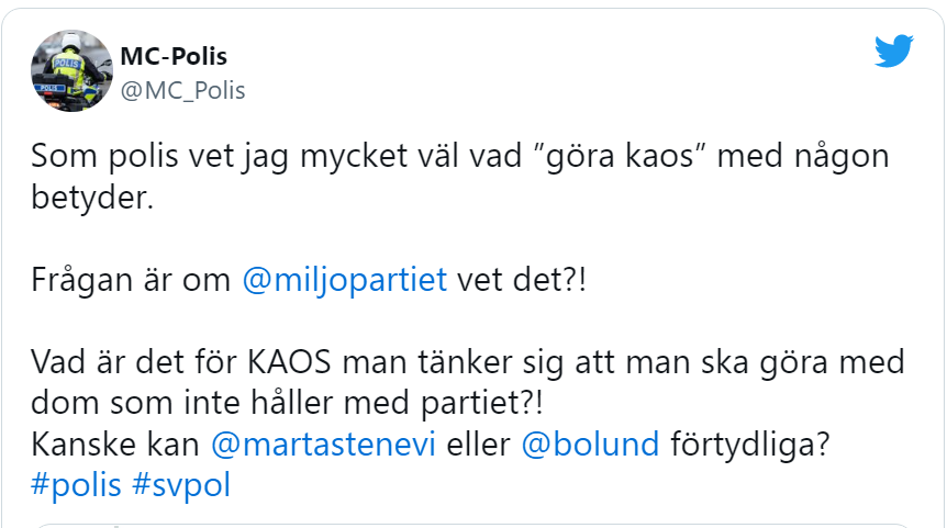 Det svenske Miljöpartiet (MP) kommer med friske utspill på Twitter. De siterer talspersonen Märta Stenevi, som blant annet sier at MP skal «lage kaos» for alle som står i veien for partiets politikk.