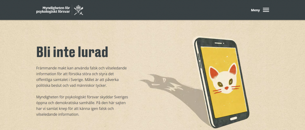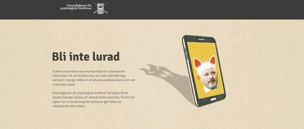 Så hva gjorde den nye myndigheten for å motvirke fremmed makt? Vel, de lanserte en stor reklamekampanje som nå ruller i T-banen, på bussholdeplasser og på reklametavler, en kampanje som advarer om faren ved humor. Men myndigheten nøyde seg ikke med dét. Den lanserte også siden bliintelurad.se, hvor besøkende ønskes velkommen slik: