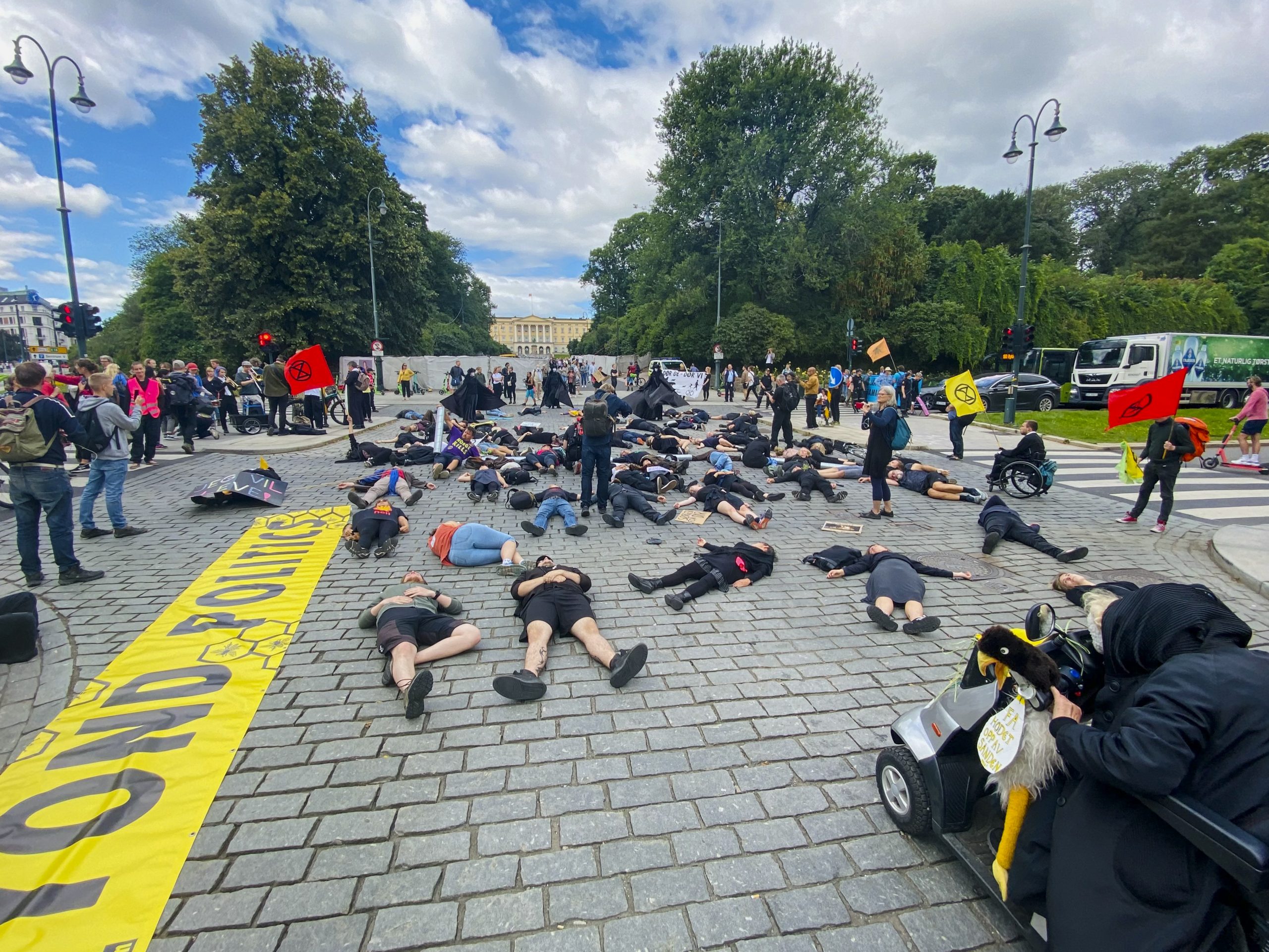 Klimaaktivistene lå rett ut på Ring 1 nedenfor Slottet og sperret morgentrafikken. To av aktivistene, i 30- og 40-årene, fikk først 17.000 kroner hver i bot av Oslo-politiet, men nektet å betale.
