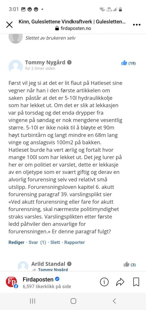 – Dersom 100 til 500 liter eller mer skulle lekke ut via turbinbladene, vil oljen kunne ødelegge nedslagsfeltet til drikkevann over stor avstand. Dette oljeutslippet ble oppdaget ved en tilfeldighet, og det er ingen betryggelse. Dette er neppe siste gang slikt skjer ved norske vindkraftverk. Alle som har advart mot dette, er ikke blitt hørt. Myndighetene har delt ut konsesjoner som om det var sukkertøy på 17. mai, og opptrådt som advokatkontor for utbyggerne. Har noen gått til sak stiller staten opp som partshjelp for utbyggerne. Dette gir ekstra grunn til bekymring for fremtiden.