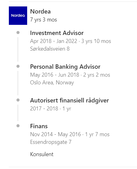 Han bekrefter imidlertid at 32-åringen har sluttet i banken, og sier at han ikke har jobbet i banken i inneværende år. Opplysninger mannen selv har oppgitt på sin LinkedIn-side tyder på at han sluttet i Nordea ved årsskiftet, og altså ikke for «et års tid siden».