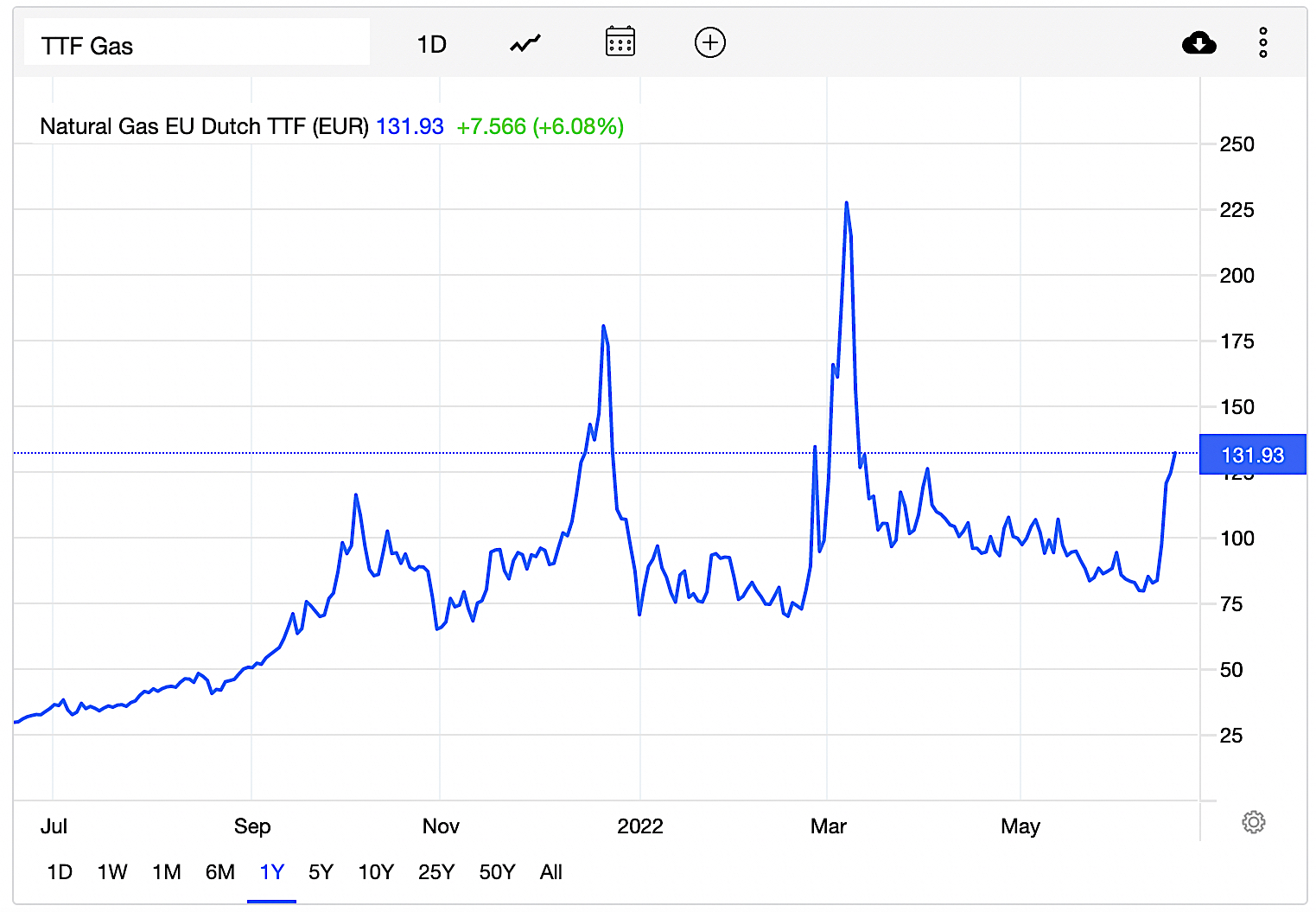 De siste dagenes kutt i Russlands gasseksport til Tyskland og Italia har sendt gassprisen i Europa oppover igjen, etter en langsomt nedadgående trend siden prissjokket ved utbruddet av Ukraina-krigen. Fredag reduserer Russland eksporten til Italia til 50 prosent, skriver Corriere della Sera.