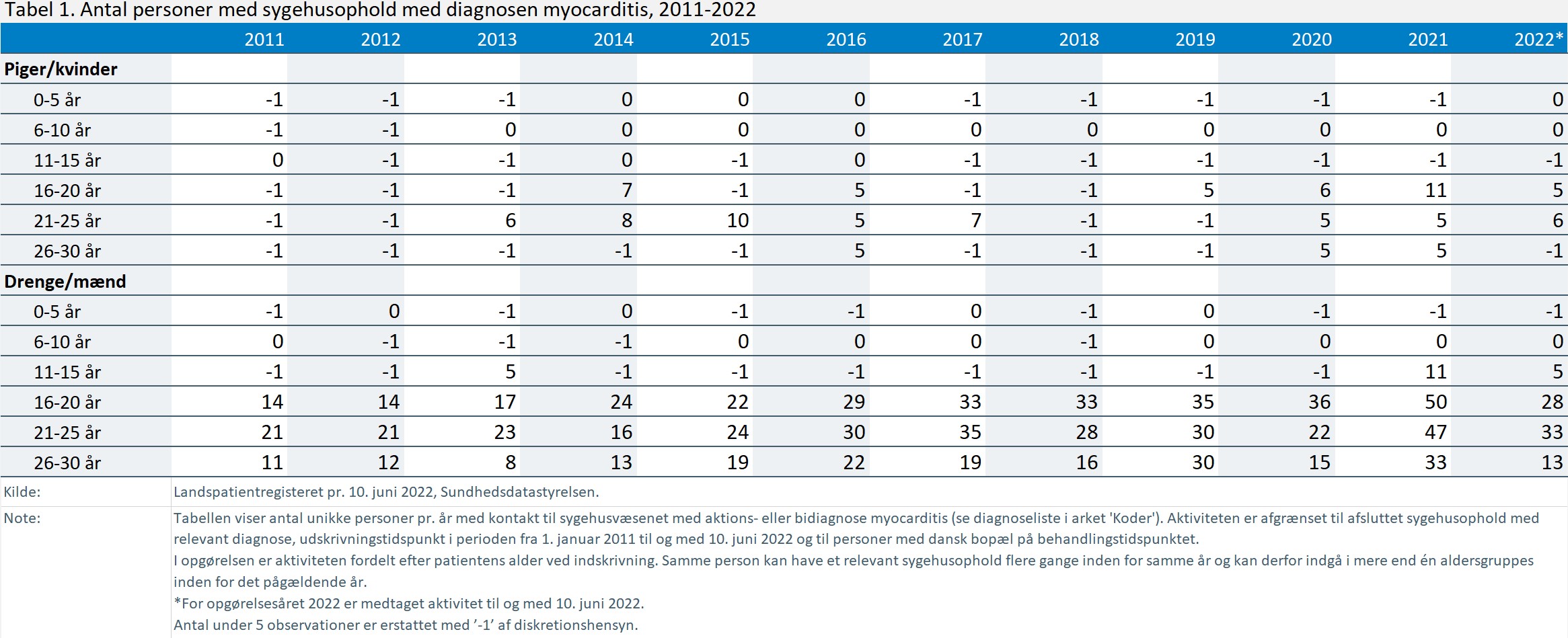 Data fra den danske Sundhedsdatastyrelsen over antall 0–30-åringer diagnostisert med myokarditt i perioden 2011–2022, bekrefter tilsvarende data fra flere land: Dataene viser at spesielt gutter og unge menn er utsatt for en plutselig økning av denne hjertesykdommen. For unge kvinner er det bare i aldersgruppen 16–20 år at det påvises økning i antall tilfeller.