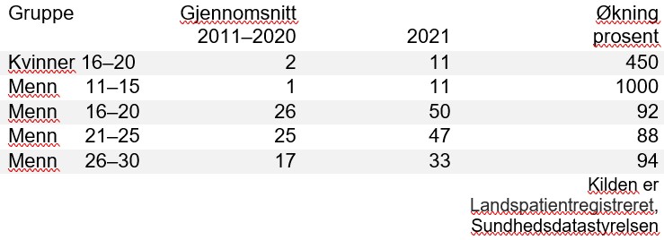 Det er danske Cand.scient. Per Brændgaard som har fått dataene fra Sundhedsdatastyrelsen. Her finner du tabellens kildedokument.