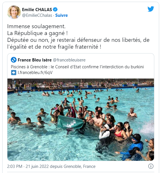 Men ordføreren i Grenoble, Eric Piolle, ville at man skulle «ha på seg hva man vil» i byens bassenger og ville tillate burkinier allikevel. «I praksis svømmer ikke fundamentalistiske islamister i det hele tatt», var et av hans argumenter. Piolle mener at dette er en form for kvinnefrigjøring og at det er diskriminerende å ikke tillate burkini.