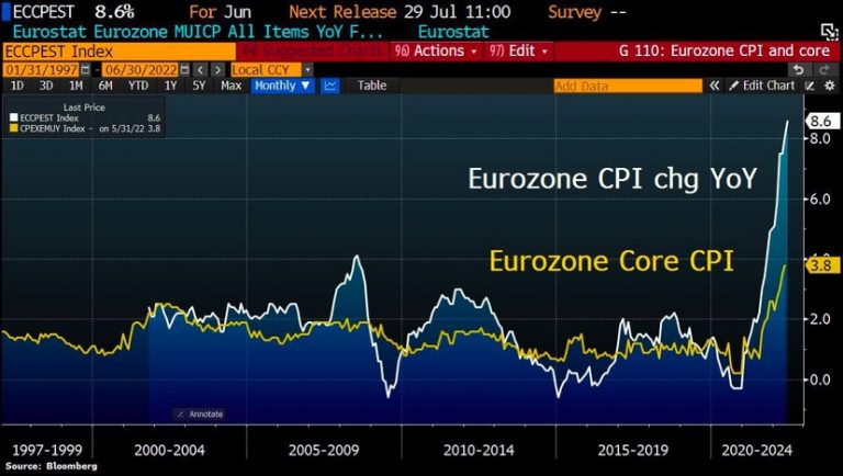 Inflasjonen i EU-sonen, hvor valutaen euro er klingende mynt, nådde i juni et nivå på hele 8,6 prosent. Der er det høyeste nivået siden euroen ble innført i 1991.