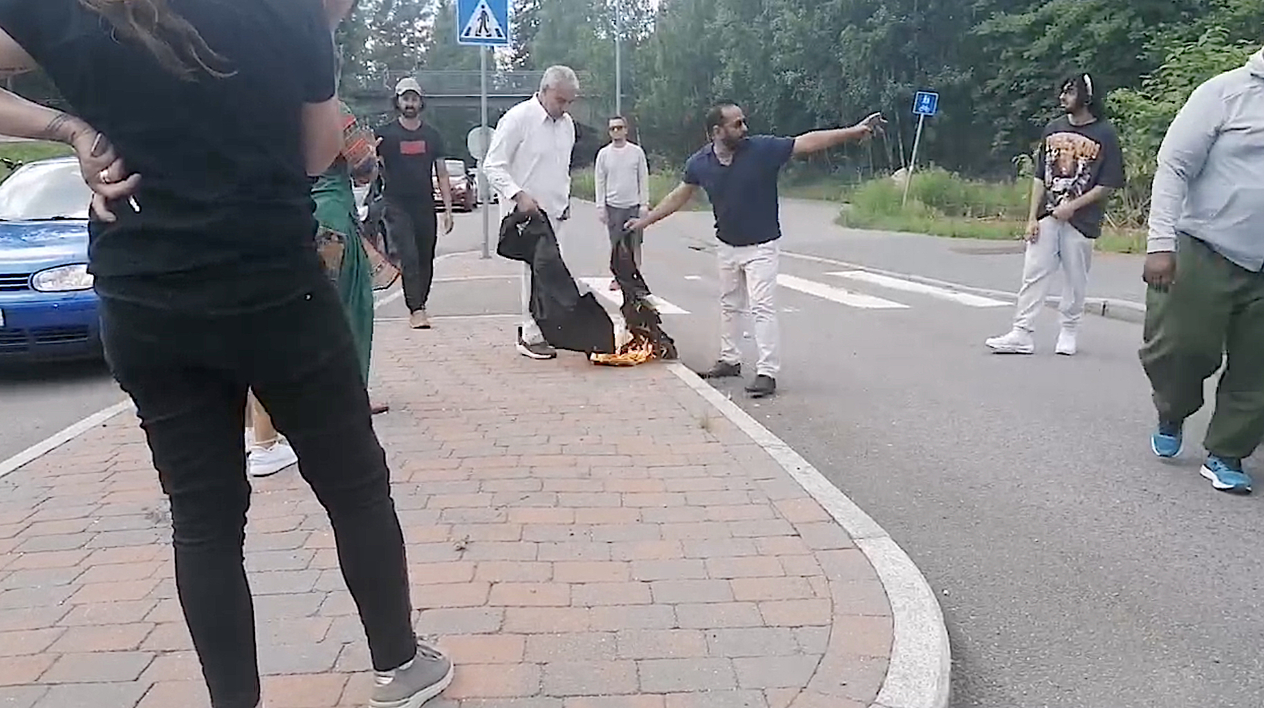Ferden går videre til en rundkjøring i nærheten av moskeen Søndre Nordstrand Muslimske Senter på Mortensrud i Oslos sørøstlige periferi. Der setter SIAN fyr på nok en koran, innen en mann kommer til stedet for å prøve å slukke brannen med jakken sin. SIAN-aktivistene vil hindre ham i sitt ærend, men mannen får raskt hjelp av andre som kommer til stedet.