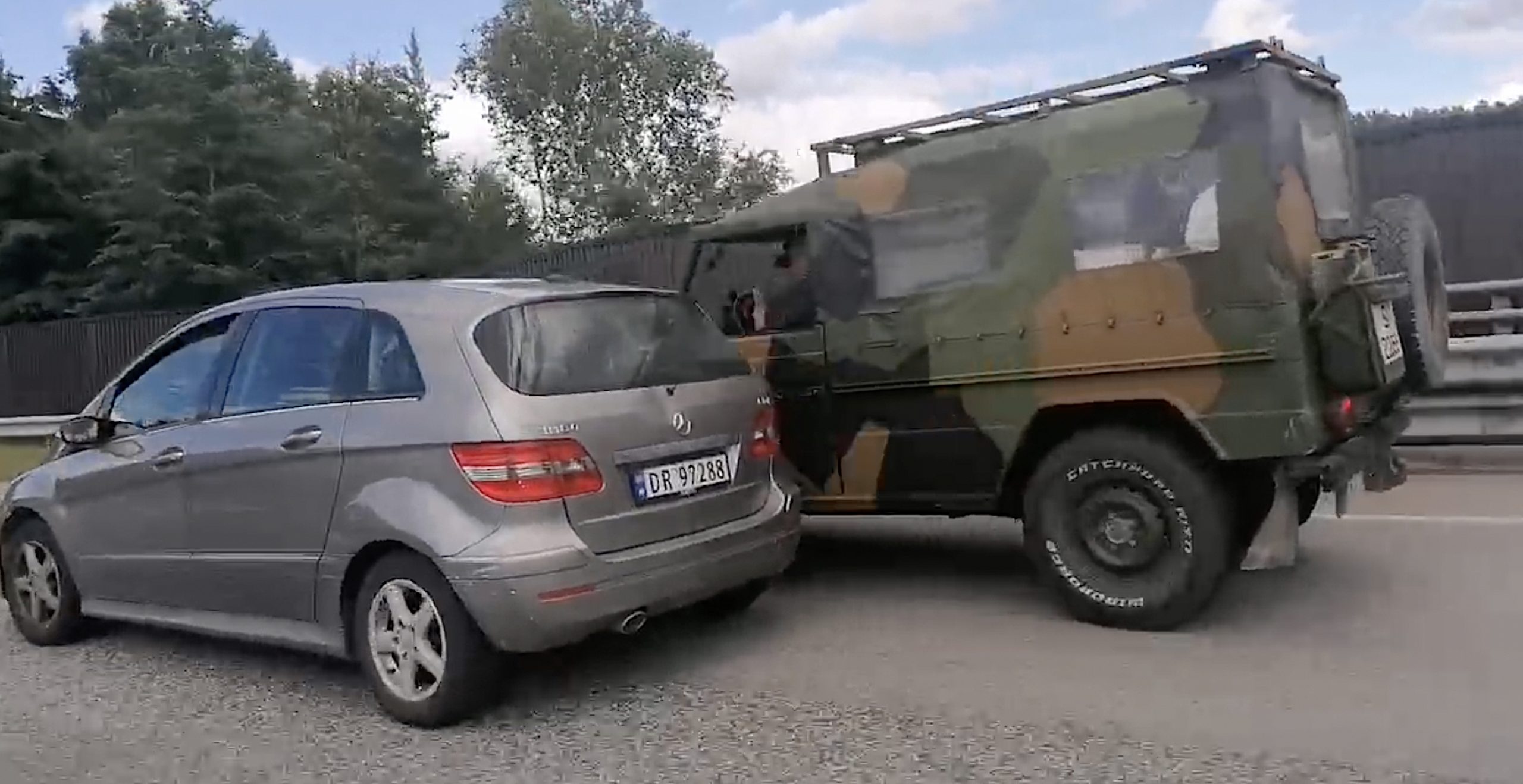 Bilen med de to kvinnene kjører forbi Alternativ Media og gjør et første forsøk på å presse SIAN-bilen av veien.