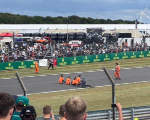 Storbritannia Grand Prix fikk en dramatisk start da flere førere krasjet i første sving. Lenge fryktet man at en av førerne hadde omkommet. Så kom nyheten om demonstranter ute på banen.