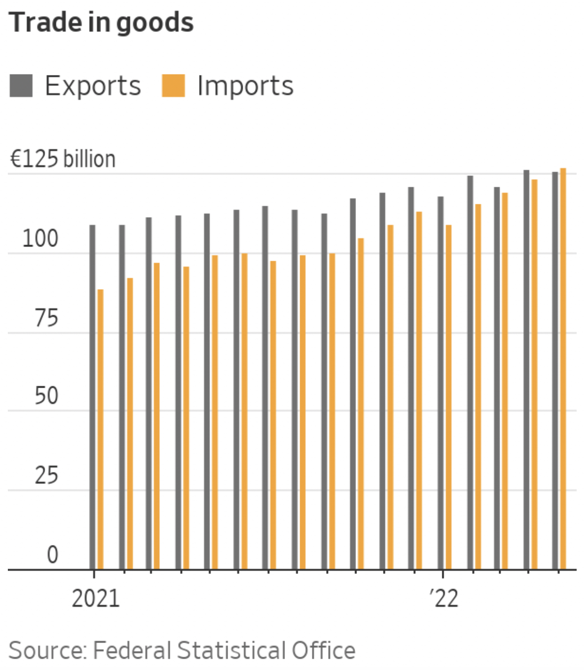 Tyskland hadde i mai et underskudd på handelsbalansen på én milliard euro, hovedsakelig på grunn av høyere energipriser. Tyskland har ikke hatt negativ handelsbalanse siden landet ble gjenforent i 1991.