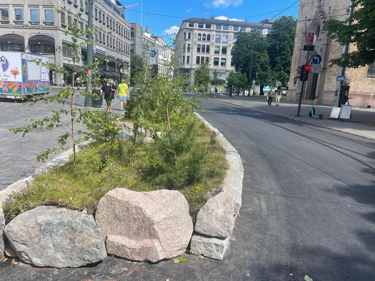 En haug av steiner, noen pjuskete busker og trær samt mye ugress dumpet ned midt ned i sentrum. Dette defineres av MDG som «bilfritt byliv» og selve lykken for alle som bor i Oslo. Foto: Document