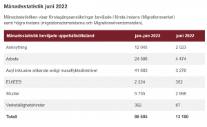 Men statistikk lyver ikke selv om politikerne gjør det, og tallene taler for seg selv: Den storstilte innvandringen til Sverige har fortsatt – og nå skyter den ytterligere fart. I løpet av første halvår 2022 ble det gitt 86.685 oppholdstillatelser i Sverige. Hvis trenden fortsetter, vil landet ha gitt 173.370 oppholdstillatelser i 2022. Dette er et tall som overstiger både 2015 og 2016, år som regnes som «ekstreme».