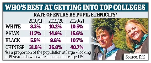 Hvite britiske studenter får kontinuerlig høre om sitt «hvite privilegium». Realiteten er en annen. Hvite britiske studenter har nå lavest sjanse til å komme å komme inn på engelske toppuniversiteter (Russell Group – 24 universiteter som inkluderer Oxford og Cambridge). For studieåret 2020/21 så havnet de nederst på rangstigen, forbigått av svarte, asiater (pakistansk, indisk og bangladesisk bakgrunn) og ikke minst kinesere som totalt dominerer listen for prosentvis opptak.