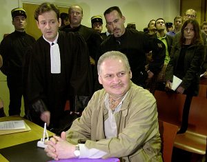 Sjakalen i fransk rett omringet av advokater, opprørspoliti og journalister. Foto: Michel Lipchitz / AP / NTB
