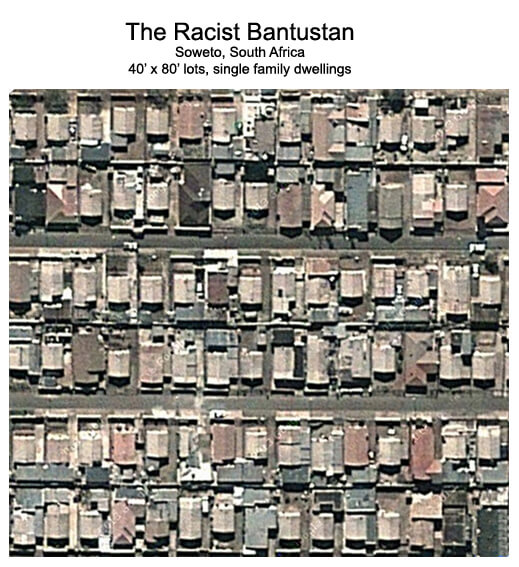 This image, which corresponds to a population density exceeding 20,000 people per square mile, reveals how blacks in Soweto were pushed into packed neighborhoods where they could easily be contained in the event of mass civil unrest.