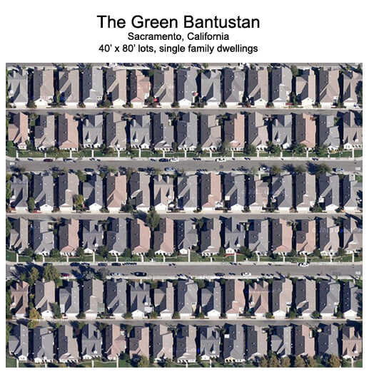 Nedenfor et bilde av et foraktet område i Sacramento. Dette er alt for god plass for en familie å boltre seg på, mener de venstreliberale klimaideologene. Legg merke til de minimale tomtene.