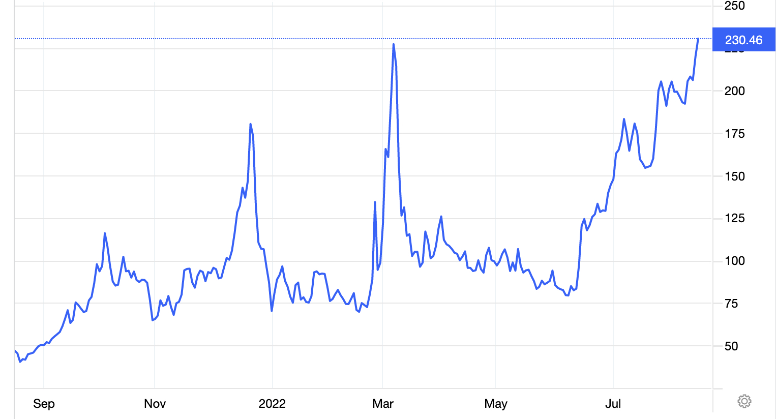 Samtidig fortsetter gassprisen på TTF-børsen i Amsterdam å stige. Prisen er i skrivende stund 230,46 euro/MWh, et nivå som overstiger den sjokkartede prisen som fulgte kort etter Russlands invasjon av Ukraina.
