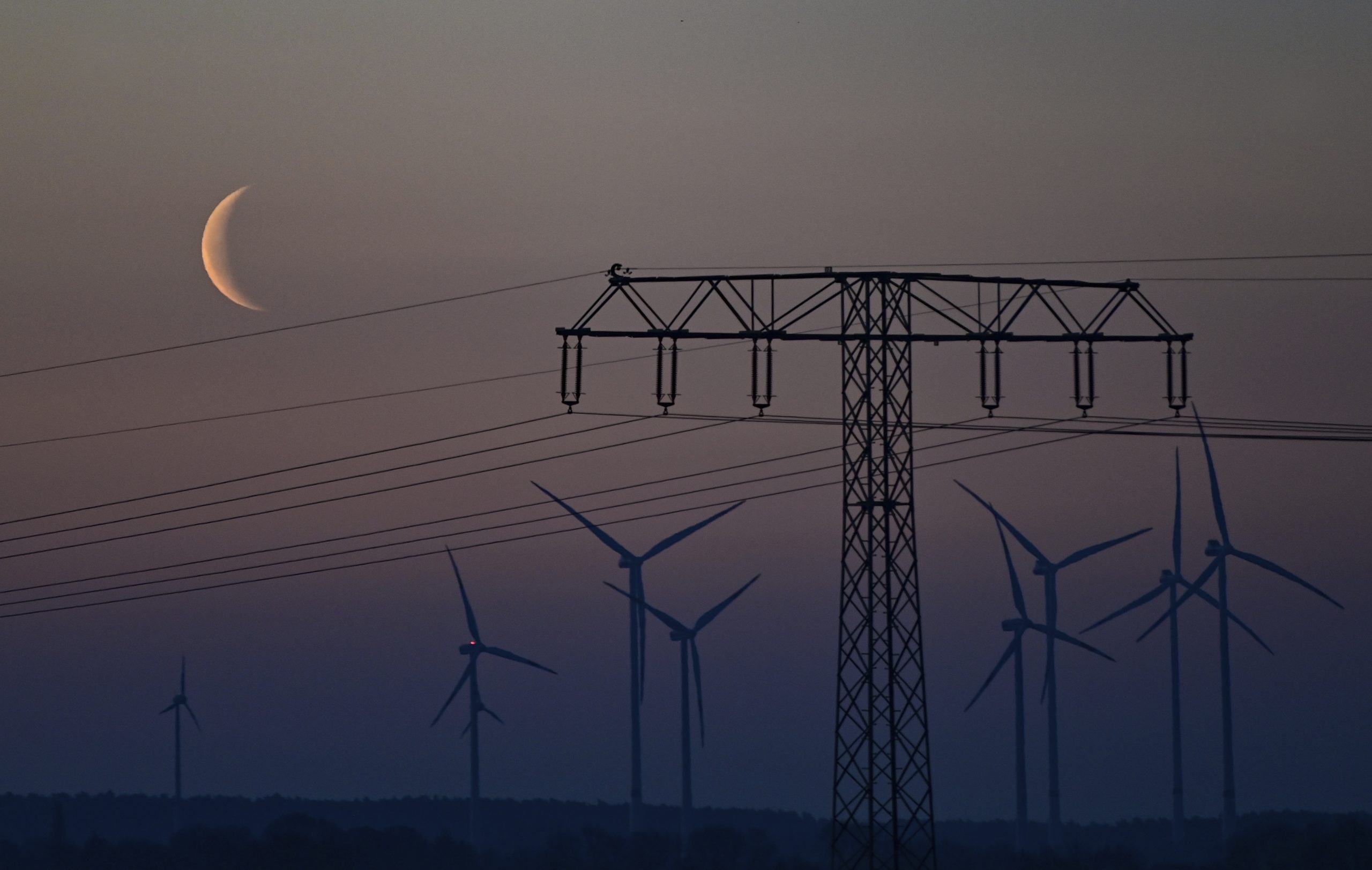Kraftlinje, vindmøller og halvmåne ved daggry et sted i Brandenburg 28. mars 2022. Foto: Patrick Pleul / DPA via AP / NTB.