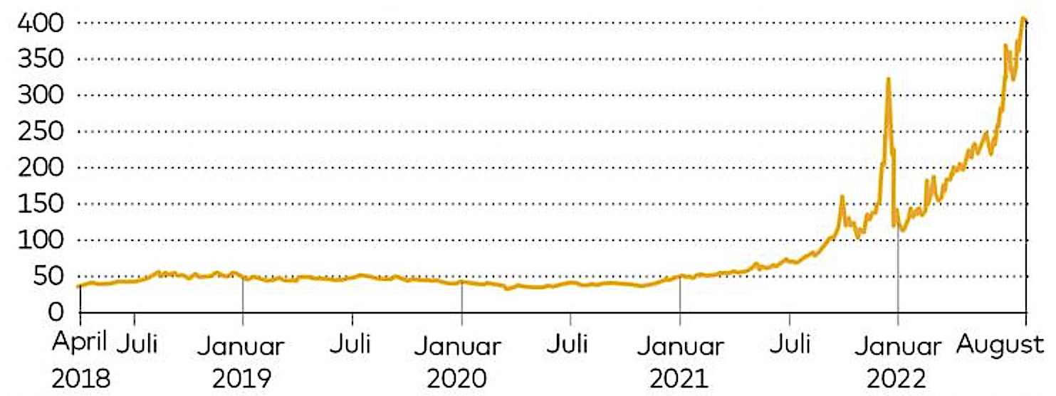 Dermed er strømprisen i Tyskland blitt nesten seksdoblet i løpet av det siste året, og fordoblet bare i løpet av de to siste månedene, melder Bloomberg. Prisen har hatt en eksponentiell trend med ett større og noen mindre sjokk siden januar i fjor: