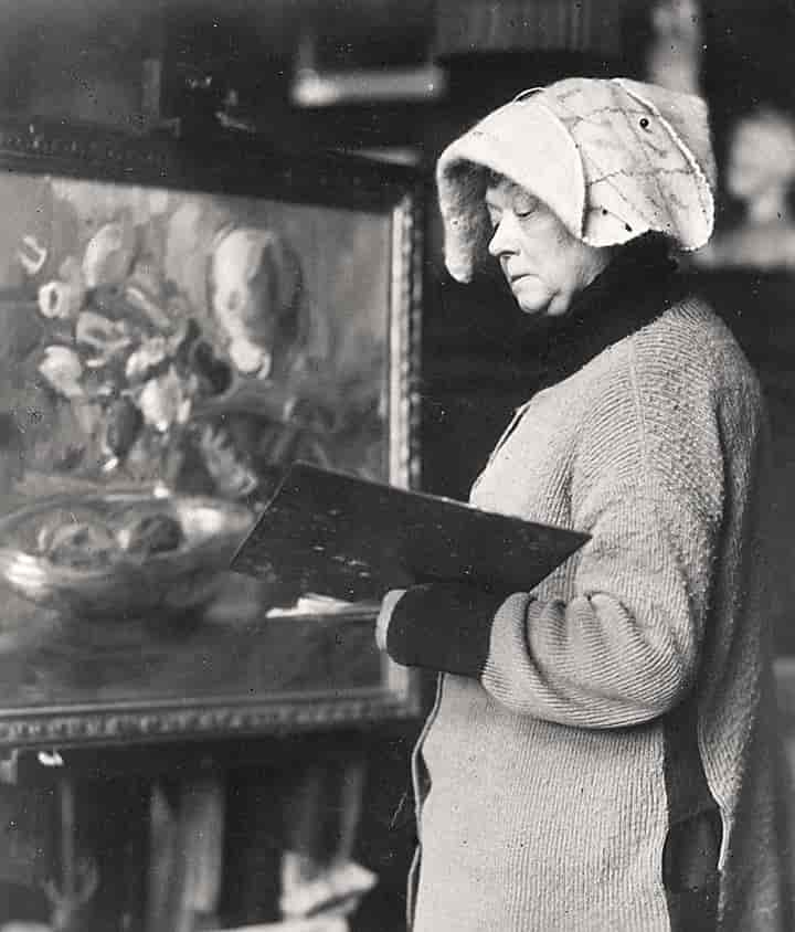 På dette fotografiet, tatt rundt 1920 i hennes atelier i Hansteens gate 2 i Kristiania, arbeider hun med Evighetsbildet, som det etter hvert ble kjent som.