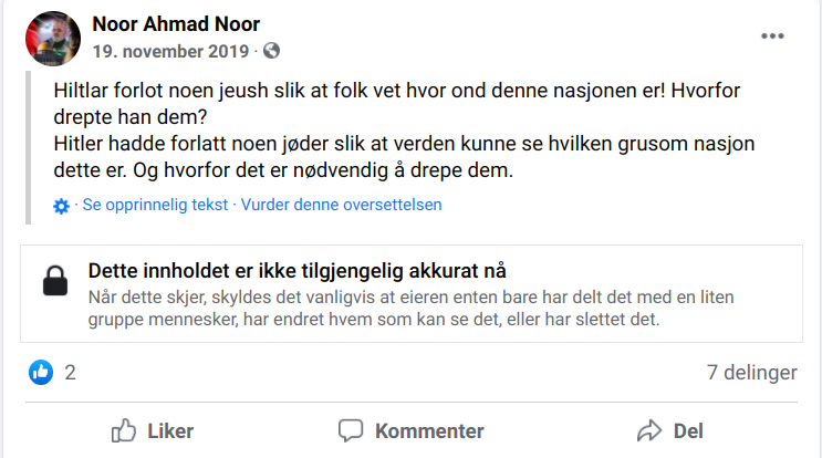 Noor Ahmed Noor ble i begynnelsen av august i fjor anmeldt av en privatperson og senere av Anti-rasisistisk senter for å ha postet antisemittiske utsagn på Facebook.