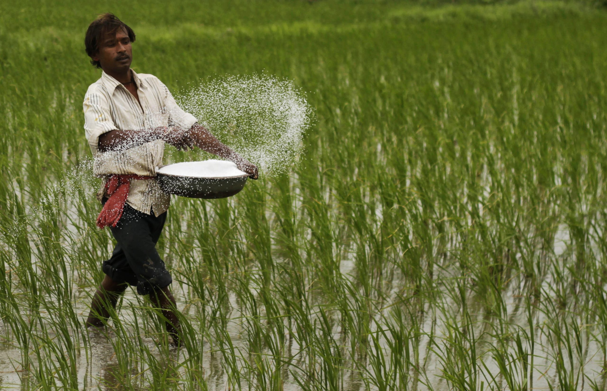 En indisk bonde sprer kunsgjødsel på en rismark i Sanand utenfor Ahmedabad. Foto: Ajit Solanki / AP / NTB.