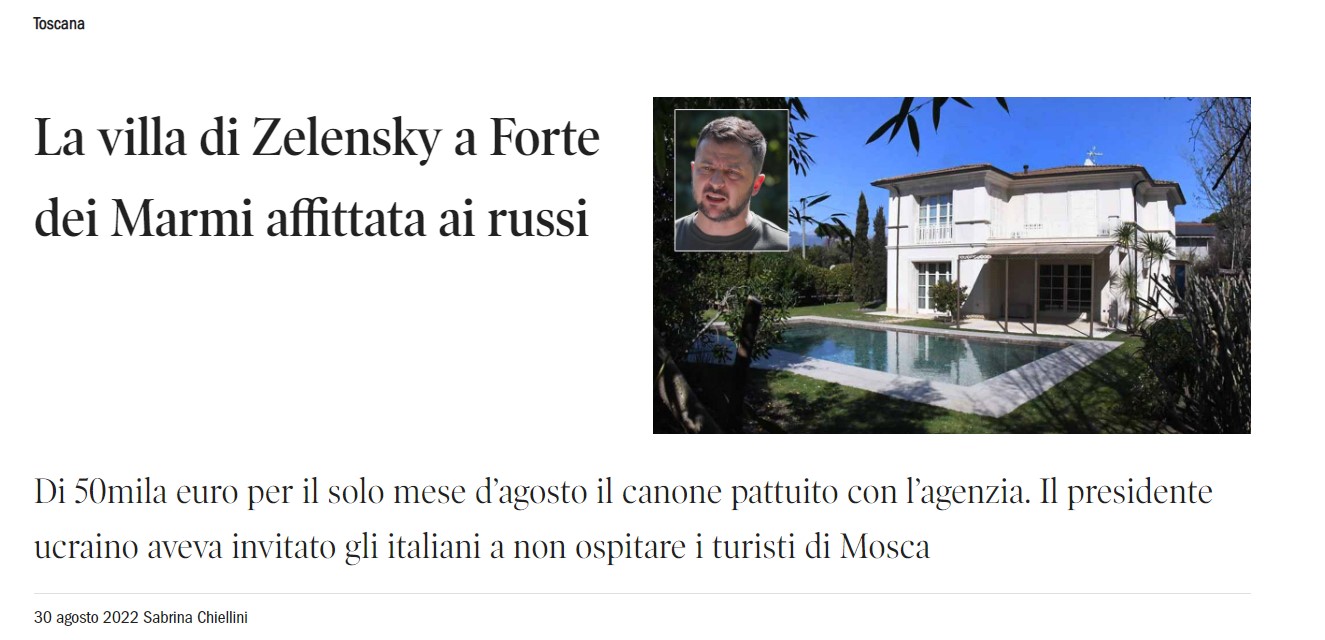 – Zelenskyjs villa i Forte dei Marmi utleid til russere, sto det på forsiden av den italienske avisen Il Tirreno, torsdag 30. august. Skjermdump: Il Tirreno