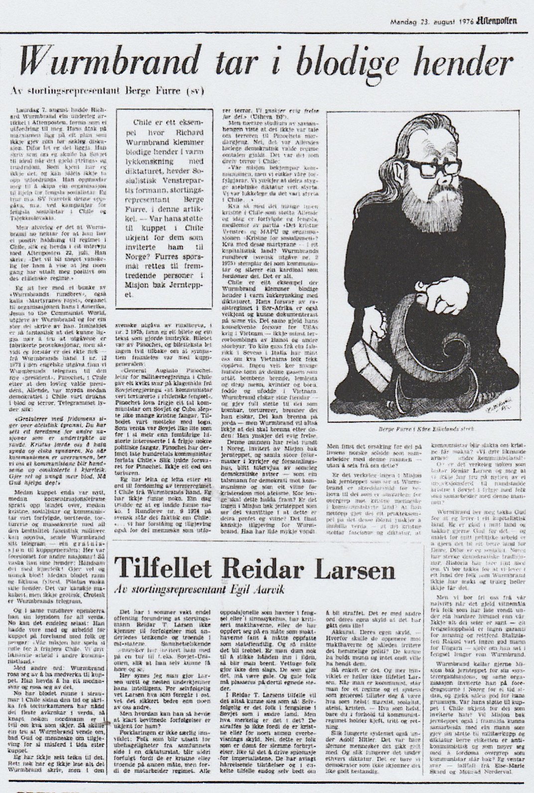 ANGREP: Det er neppe grunn til å betvile at SV-leder Berge Furres perfide angrep på den rumenske dissidenten Richard Wurmbrand ga ham og andre SV-topper plass ved den rumenske tyrannens festbord både i Bucuresti og ved Svartehavet. Behandlingen av Wurmbrand og Misjon bak Jernteppet er et av den norske kirkes og venstresidens minst ærerike kapitler. Faksimile fra Aftenposten 23. august 1976 med Furres åpningssalve.