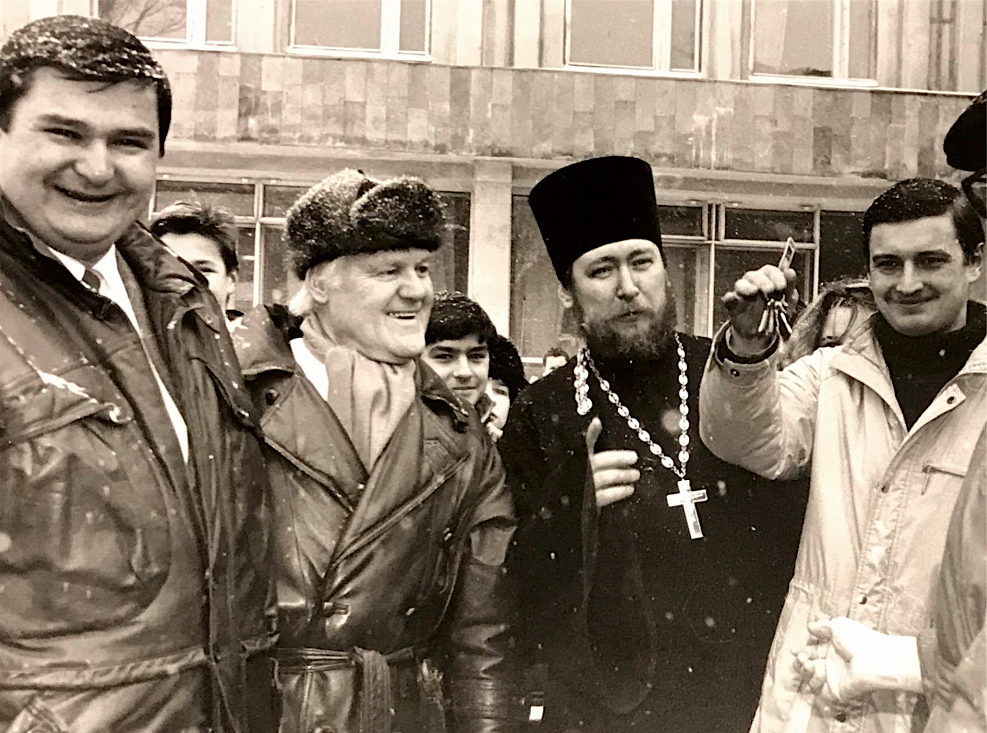 MURENS FALL: Murens fall og Sovjetunionens oppløsning i 1989-91 ledet til et nærmest euforisk oppsving i troen på en fremtid uten konflikter. Vesten hadde seiret, og markedsøkonomien og den kristne-liberale ideologien med tro på individets frihet og rettigheter ville snart bli omfavnet av hele verden. Slik gikk det ikke. I dag raser en blodig krig i Ukraina, og totalitære bevegelser som politisk islam og Kinas variant av kommunismen er på fremmarsj, mens Vesten sykner hen i nærmest uforståelige politiske konflikter, drevet av undergangsfantasier og massepsykose. Det totalitære er aldri mer enn en generasjon unna. Bildet viser Hans Myrvold (nr. 2 fra venstre) sammen med en ortodoks prest etter en felles gudstjeneste. Bibelsmuglingen var over, men de kristne verdiene var fortsatt under press. Foto: Privat.